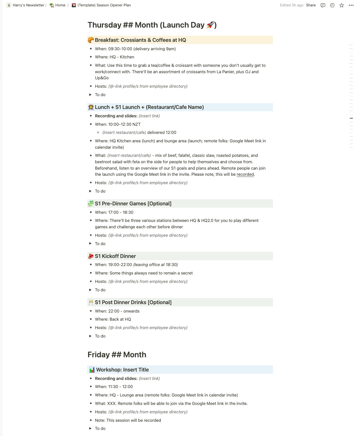 Season Opener Plan: end-to-end plan or agenda to design your week, and eventually, share with your team. See a screenshot of our “Launch Day” on the Thursday below.